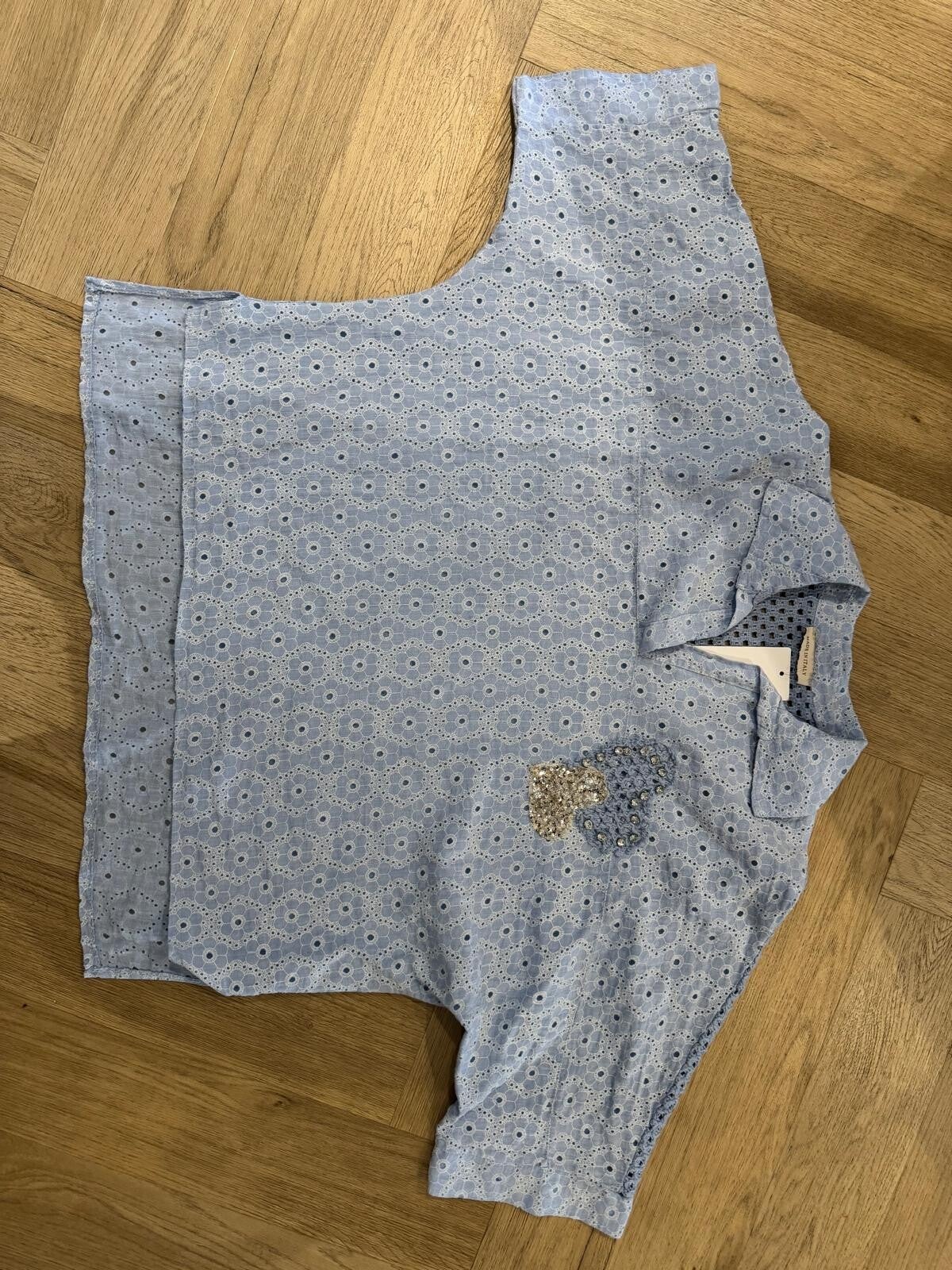 0Deze prachtige set bestaat uit een luchtige blouse en een wijde broek, gemaakt van een zachte, ademende stof met een subtiel bloemenpatroon. Het glinsterende hartdetail geeft de outfit een vrouwelijke en speelse uitstraling.