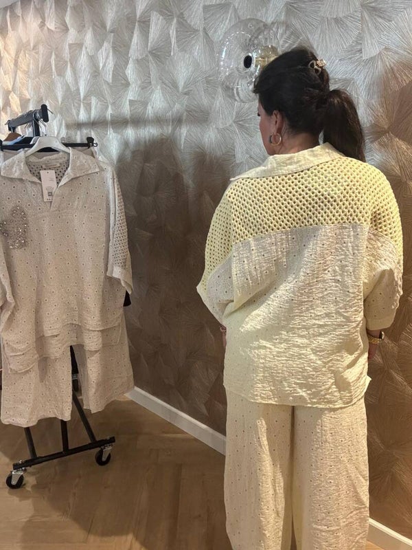 Deze prachtige set bestaat uit een luchtige blouse en een wijde broek, gemaakt van een zachte, ademende stof met een subtiel bloemenpatroon. Het glinsterende hartdetail geeft de outfit een vrouwelijke en speelse uitstraling.